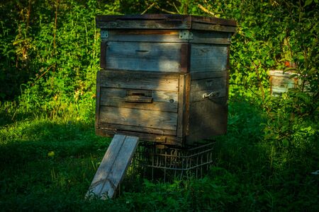 Bee hives of a beekeeper in the care of bees with honeycombs and honey bees