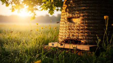 A traditional woven straw beehive, or skep, sits in a grassy meadow bathed in the warm golden light of sunrise. Bees can be seen flying near the entrance, highlighting the activity of a healthy pollinator colony.