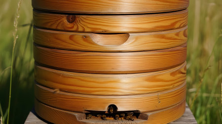 A close-up view of stacked wooden beehive boxes in a garden, with honeybees active at the entrance. The natural wood texture and the bustling activity of the insects highlight the practice of sustainable beekeeping.