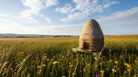 A traditional straw skep beehive stands in the middle of a vibrant wildflower meadow under a blue sky with clouds. Bees swarm around the entrance, gathering nectar from the surrounding blooms.