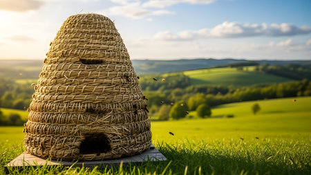 A traditional woven straw beehive, or skep, sits on a wooden base in a lush green field under a blue sky. Bees buzz around the hive in a peaceful rural landscape, representing sustainable agriculture.
