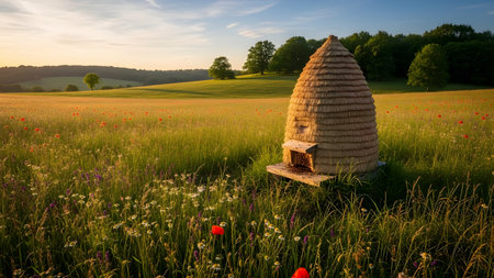 A traditional woven bee skep stands in a golden grassy field, bathed in the warm light of the setting sun. Bees can be seen entering the hive, set against a backdrop of rolling hills and trees, evoking a sense of rural heritage and sustainable agriculture.