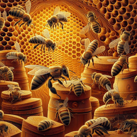 Digital Asset Vault. Inside a beehive vault, worker bees deposit honeycombed assets into secure cells, queen overseeing distributions, hive structure