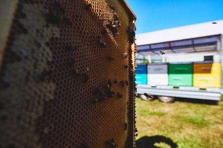 Close up showing honeycomb with bees working on surface, colorful beehives standing in background on sunny day, outdoor apiary scene highlighting beekeeping process