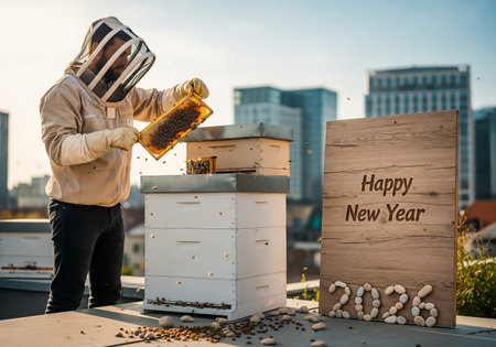 A beekeeper inspects a hive on a rooftop with a Happy New Year 2026 sign, blending nature and city life.
