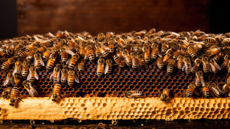 Bees swarming on honeycomb, extreme macro footage. Insects working in wooden beehive, collecting nectar from pollen of flower, create sweet honey. Concept of apiculture, collective work.