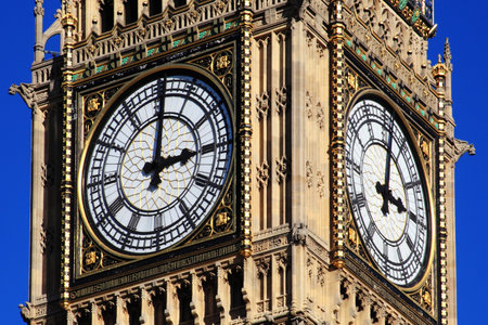 Clock face on the famous landmark clock tower known as Big Ben in London, England.