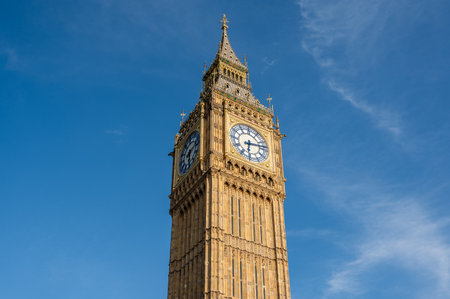Iconic Big Ben clock tower against a blue sky: A detailed close-up of London's famous landmark, emphasizing its intricate golden and weathered stonework.