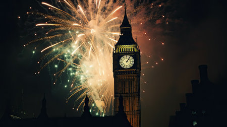 Big Ben Clock Tower at Twilight, London England Festive Illumination and Bokeh Lights