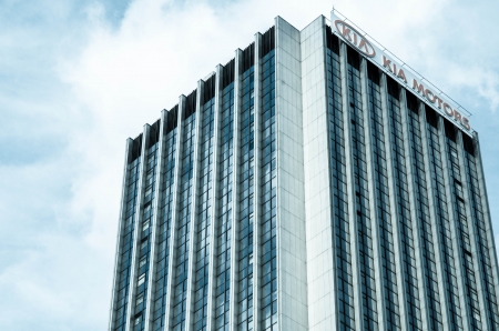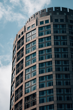 Symmetrical glass skyscraper with numerous windows standing proudly on the city skyline