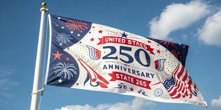 Patriotic American flag banner with Statue of Liberty fireworks and 250 years Independence anniversary theme. .