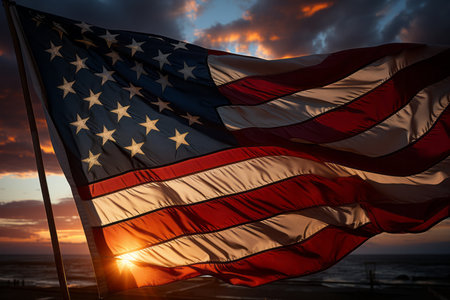 United States Flag Waving at Sunset – American Patriotic Symbol Against Sky Background