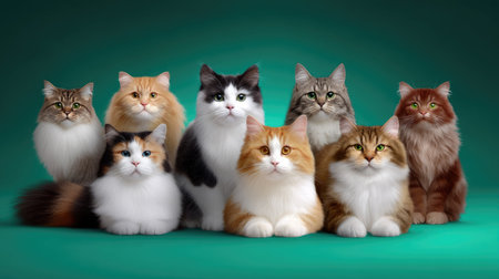 A charming collection of cats sits together in perfect harmony, showcasing their distinct fur patterns and vibrant personalities against an eye-catching green backdrop.