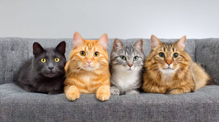 A charming scene featuring four distinct cats sitting closely on a soft sofa, showcasing their unique fur patterns and vibrant personalities in a cozy indoor environment.