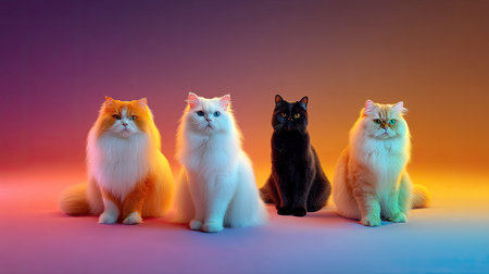 A stunning portrait of four fluffy cats against a vibrant gradient backdrop that creates a charming and inviting atmosphere, perfect for showcasing feline beauty.