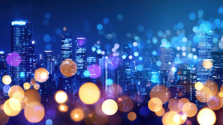 A breathtaking view of a modern city skyline at night, featuring colorful bokeh lights that create a dreamy atmosphere, enhancing the architectural beauty of skyscrapers.