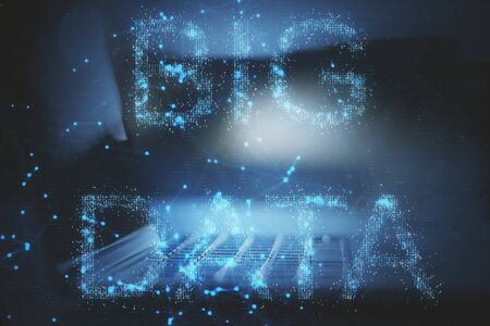Creative Data word hologram on modern laptop background, big data and blockchain concept. Multiexposure