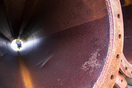 A series of large, industrial metal pipes create a tunnel-like effect, the viewer into a perspective of depth. The metallic surfaces, predominantly silver and dark gray, show signs of rust and corrosion, adding a weathered and aged character. The ribbed and corrugated texture of the pipes suggests a strong, robust structure.
