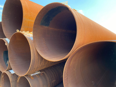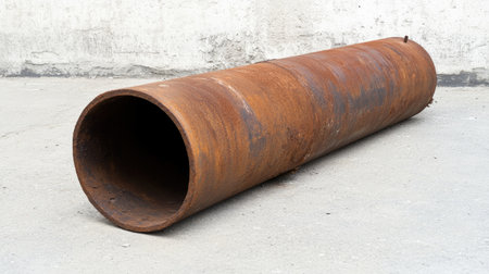 A large iron pipe laid on a concrete surface, showcasing a rusty and weathered appearance. This industrial element highlights construction themes.