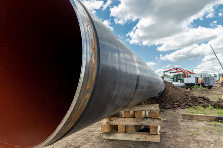 Gas and oil pipeline construction. Pipes welded together. Big pipeline is under construction.