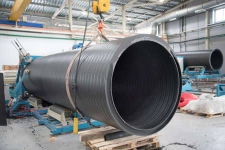 The process of threading a large plastic pipe. Factory for the production of plastic pipes.