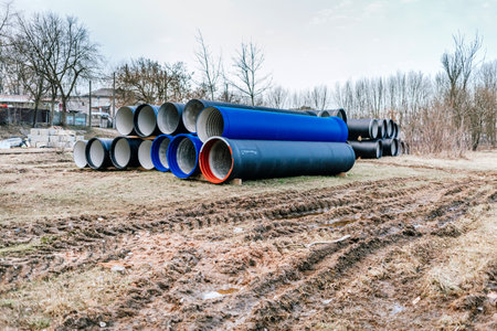 Water pipes for drinking water supply lie on the construction site. Preparation for earthworks for laying an underground pipeline. Modern water supply systems for a residential city