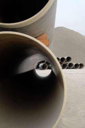 Construction site, PVC pipes for sewerage pipeline, plumbing materials for repair