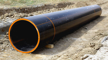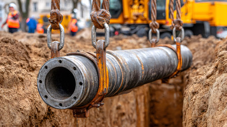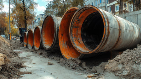 Large pipe lying centered in a freshly dug trench with construction workers and equipment visible in the background, signifying ongoing groundwork and future urban development