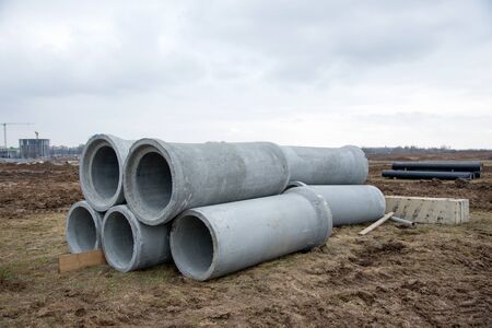 Concrete sewer pipes for laying an external sewage system at a construction site. Sanitary drainage system for a multi-story building. Civil infrastructure pipe, water lines and storm sewers