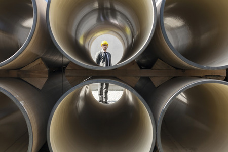 A worker in bright protective gear stands guard before massive steel pipes in a factory.