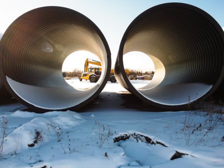 A striking image of neatly arranged concrete pipes in a straight line, creating a minimalistic industrial landscape. The scene captures an expansive view with a clear sky and distant horizon.