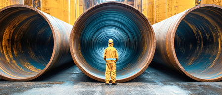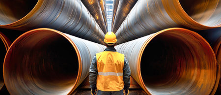 Standing in front of massive steel pipes, a worker in protective gear faces away, immersed in the industrial environment filled with soft light and low contrast.