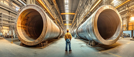 A dedicated worker in protective gear faces large steel pipes within a factory, embodying the spirit of hard work in a detailed industrial environment filled with soft light.