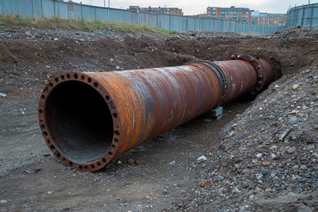 An old, rusted metal pipe is partially buried at a construction site, surrounded by gravel and dirt, with buildings visible in the background under a cloudy sky.