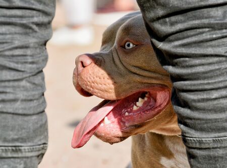 Sad pitbull portrait in sunny street, homeless dog. Volunteer walking with scared stray mix breed pitbull in shelter, adoption concept