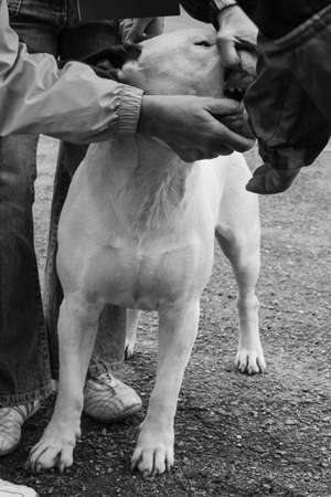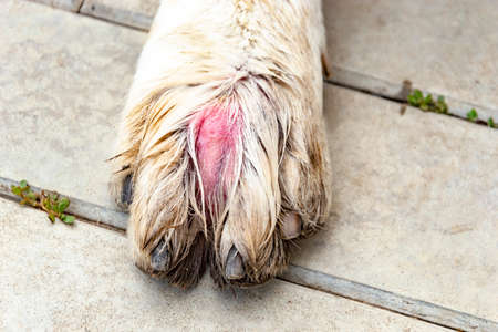 Human hand is holding a white dog's leg. Holding dog feet on hand.