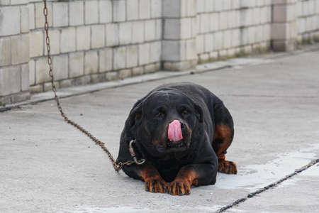 A dog tied to a chain lies on the ground. The Rottweiler lies against the backdrop of a white brick wall and looks sadly into the camera. The domestic dog licks his nose with a pink tongue.