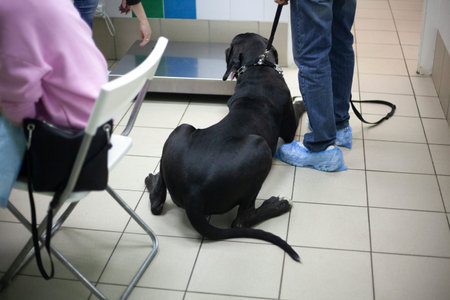 Black dog at the vet. Weighing a big dog. Pet treatment. Caring for a friend. Resistance of the beast.