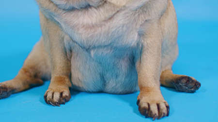 Body part of pug on blue background. Portrait of dogs big belly. Close up
