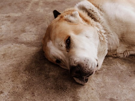 Sad dog laying down on floor at home / sleeping dog lonely animal homeless concept