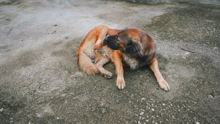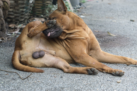 Brown dog use mouth to scratch body on the floor., It show sign of itching due to tick and flea. Dog want to take a bath., healthy concept., animal concept.