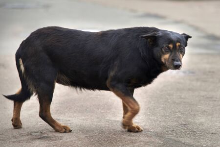 A local dog lies on the pavement and waits. An adult dog. Faithful, man's best friend. Summer sunny morning. animal