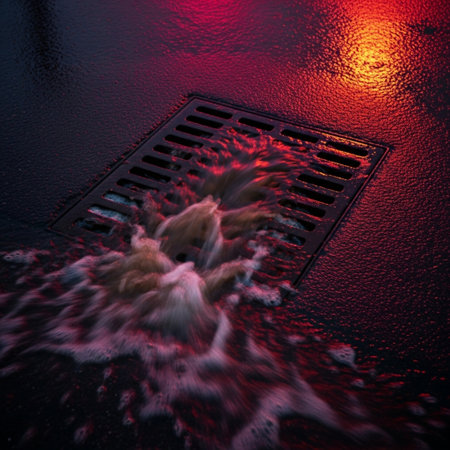 Water spilling over a blocked drain grate, leaves and garbage scattered, creating a chaotic scene