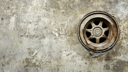 This image features a rusty drain cover set against a weathered concrete wall, showcasing grunge texture and aging details, ideal for urban-themed projects.