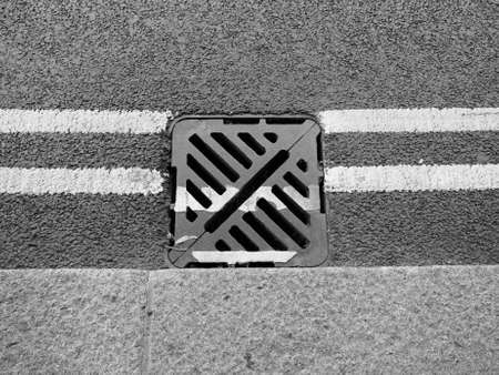 Detail of a manhole drain in the street in black and white