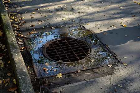 A metal drain cover sits at the center of a puddle on asphalt, reflecting the sky and surrounding environment. Fallen leaves and other natural debris float on the water's surface. The composition uses a low-angle perspective. Ideal for illustrating environmental themes and urban landscape concepts in various applications.