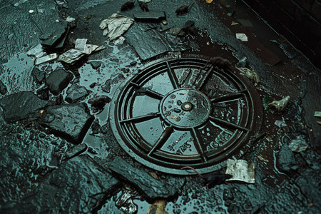 close-up of broken manhole cover with water and debris flowing out onto the street, created with generative ai