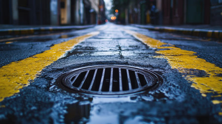 Urban road scene featuring an iron drainage hole in the center, surrounded by smooth pavement and faint road markings