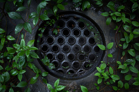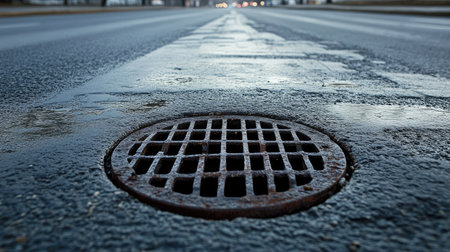 A drain with a metal grate and water on it, AI