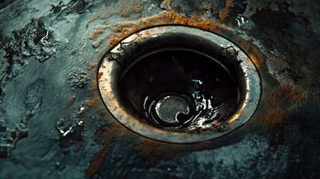 This image features a close-up view of a dark drain surrounded by water droplets, showcasing industrial textures and reflections in natural light.